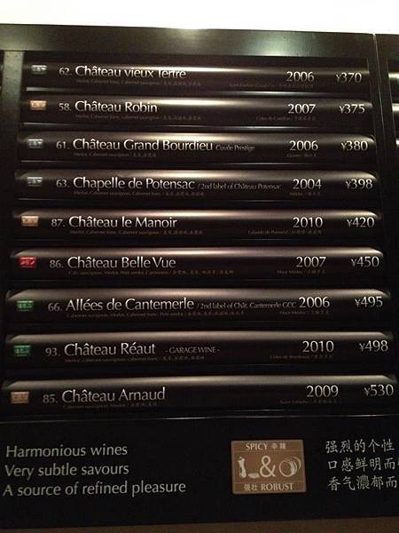 牆上立體管柱般的酒單, 使用編號, 清楚標示酒名, 年份及價格. 最棒的點子是法國老闆依 “酒的香氣口感" 將酒款先行分類. 用四種顏色來區隔酒款分類, 每款酒都有自己的編號做為身分證, 對於店內的消費者來說, 是非常不傷腦筋且簡易的消費模式. 朋友的其中一位朋友, 就是只記得自己喜歡的號碼點酒喝. 這真的是最輕鬆易懂的葡萄酒入門, 任何人只需憑藉自己的感官, 循序漸進找出自己偏愛的葡萄酒風味.