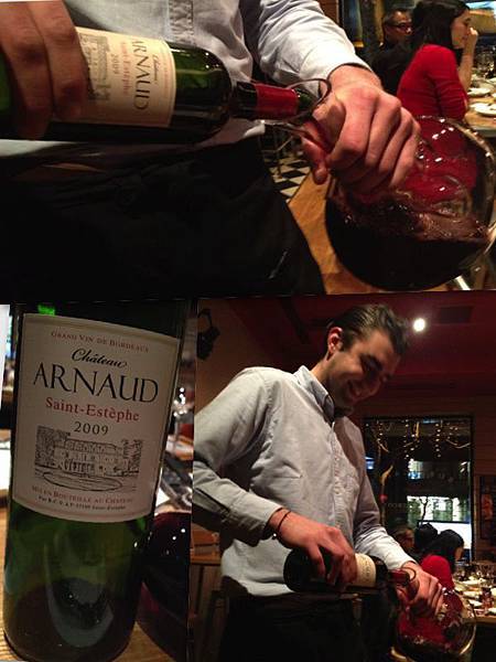 這位帥哥是店內的法國伺酒師, 因為朋友的朋友們在我抵達前已經喝了兩支酒, 我最後跟帥哥敲定這款來自波爾多左岸St. Estephe 2009 Chateau Arnaud. 他邊幫我們醒酒, 邊笑著聊天, 晚上十點多他要離店前, 還特地來打聲招呼, 果真是有訓練過的.