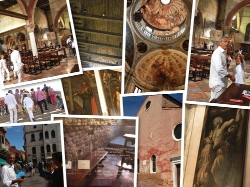 再次跨越 Ponte Scalzi, 我們往窄巷弄裡鑽, 我興奮的跟著穿梭在迂迴小徑裡, 感受威尼斯式的"迷失自我" ! 曲折的路線每轉個彎, 千變萬化又寫實的威尼斯樣貌, 就在我眼前如流星般閃過. 走著走著就走進當地最古老的教堂之一Chiesa di San Giacomo dall'Orio, 建造於9世紀, 13世紀初歷經重建, 部分裝修在15-16世紀左右完成, 內部屋頂與樑柱透露不同時期的建造風格, 還收藏許多我不認識的大師名畫.