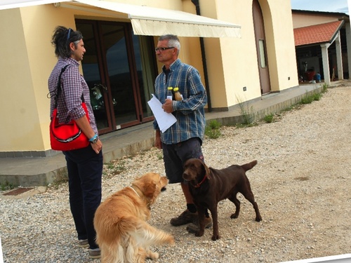 從辦公室到酒廠前那一小段路, 我們一路走過Bulichella酒莊民宿, 先是和Alessandro的兩隻愛犬見面 (一隻公的黃金獵犬, 一隻母的拉布拉多). 他似乎比較偏愛拉布拉多, 起先只放了它出來, 後來終究抵不過黃金獵犬又叫又衝的, 還是把它也一起放出來玩... 走了幾步, 我們接著遇見手裡拿著兩瓶要送驗樣品的Stefano Bonaguidi (Alessandro的父親)...