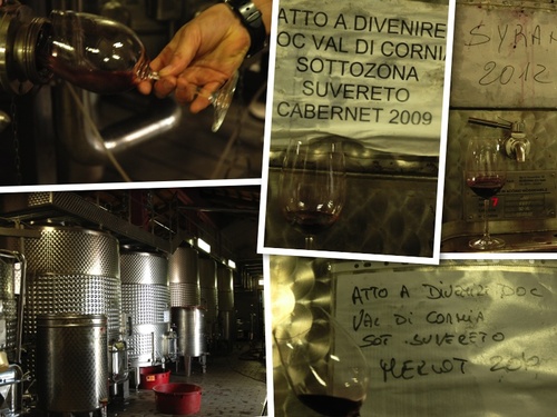 酒莊在出資的日本老闆Miyakawa加入後, 增添更新酒窖釀酒設備, 運用科技讓好的葡萄原料得以繼續發揮它的無限潛能. 我跟著Ale繞了一圈, 也嘗鮮了幾個還放在不鏽鋼槽中的Bulichella核心葡萄品種... 2010 Merlot, 2009 Cabernet Sauvignon, 2012 Syrah.. 每個品種的特色都很分明, 質優是Bulichella酒給我的第一印象! 雖然我個人比較偏愛卡本內或混調口味的酒, 但我卻頗喜歡他們果香與酸度酒體都恰到好處的梅洛.