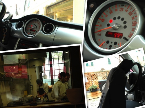 時間在參訪酒莊時轉動地似乎總是特別快, 逛完酒窖做完桶邊試飲後, Ale提議把酒拿去餐廳邊吃中餐邊試飲.他開著mini cooper進入Suvereto古城, 體貼的把兩小箱的Bulichella酒搬到餐廳, 我就在車上拍起這車門敞開, 駕駛座倒下來的隨興景象... 果真是個性情中人來著!