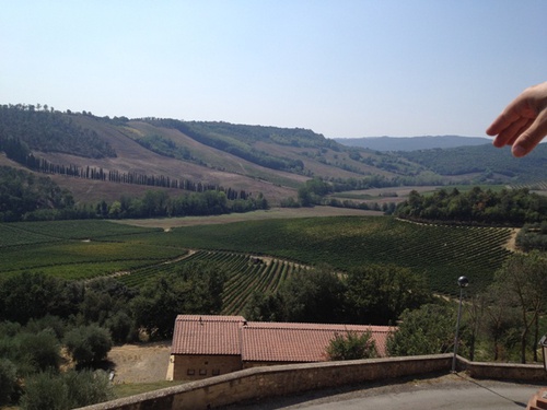 It is located on similar altitude as opposite to San Gimignano castle. You have to imagine a bit and find San Gimignano castle in the middle of the picture at very far end! 沒想到, 晚上就我一個人待在Cecchi家族在聖吉米亞諾地區的單一莊園, Castello di Montauto。下午陽光正曬時, 還頗興奮, 可以遠眺聖吉米亞諾古城....