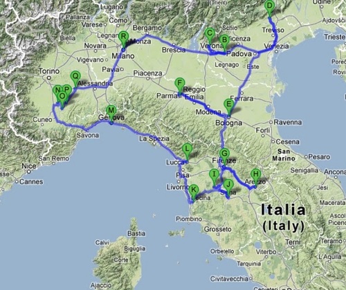 米蘭是我進出義大利的點, 利用義大利火車官網上的點對點時刻查詢表, 我把內陸段行程一個點一個點慢慢連起來。依順時針方向, 我從位於Lombardy的米蘭進到Veneto, 再往下進入美食之省Emilia Romagna, 接著來到托斯卡尼, 最後從左邊海岸線切入Piedmont, 連成一圈。