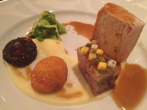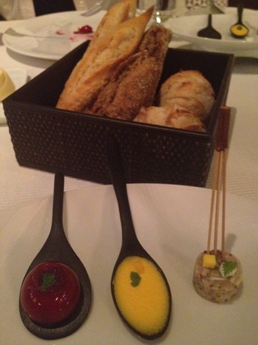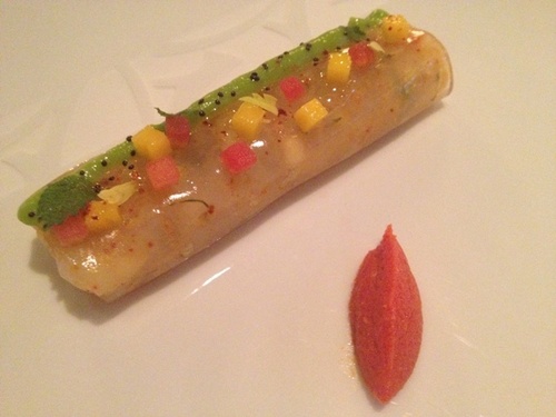 恩~ 好吃! 有開胃! 紅色的是甜菜根(beetroot) 裡面的餡好像是慕斯, 我沒聽得很清楚...就吃吃吃..