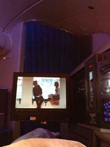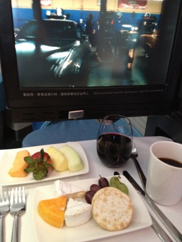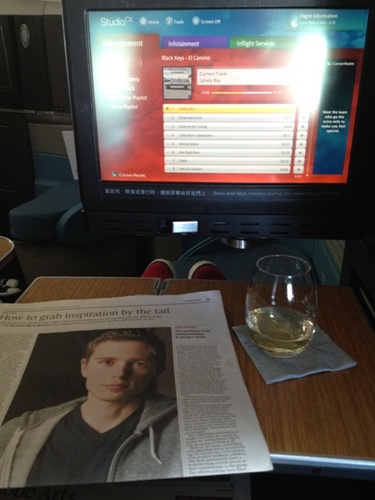 晉升商務艙, 對於飛短線如台北香港的飛行哩程及時數, 感受不到太大差異, 不過, 香港的國泰貴賓休息室 (名為寰宇堂) 還頗讚! 一走進去那種旅客等待航班的氛圍, 就已經足足差了好幾倍! 我興奮的像個小孩子般, 東繞西繞, 認識新環境。 雖然整身穿著輕便的我, 看起來就不像是出差的旅客。但沒什麼手提行李的我, 趕緊用那才剛用公司續約的IPHONE假裝一下商務人士在個人包廂中忙裡偷閒的感覺。頓時覺得兩個小時內的轉機時間好像縮短了。